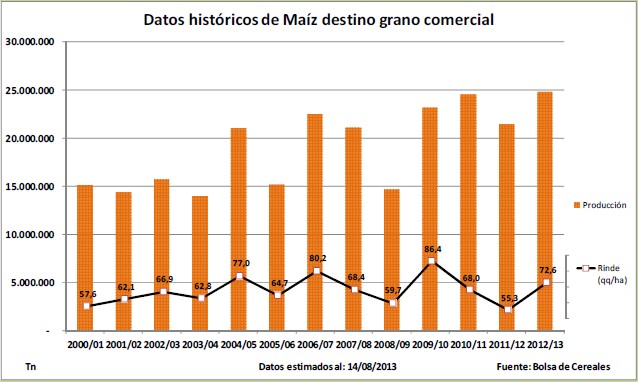 La pasada zafra (2012/13) la cual se encuentra próxima a finalizar registraría una producción de 24,8 millones de toneladas, siendo esta la mayor producción de maíz argentino en la historia. De lograrse esta cifra se encontraría en un 15,3 % por encima de lo recolectado durante la campaña 2011/12. A su vez, podemos mencionar que la superficie implantada durante la campaña en curso (2012/13) registró una caída versus el ciclo 2011/12 de un -14,7 %.