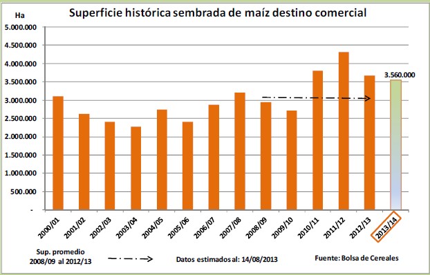 De esta forma se espera registrar una leve caída del área que rondaría el -3 % respecto de lo implantado la pasada campaña (2012/13: 3.678 MHa), registrando así una superficie de 3.560.000 hectáreas. De todos modos esta superficie se encontraría un 2 % por encima del promedio de los últimos 5 años (3.490.000 Ha: promedio 2008/09-2012/13) y un 15,5 % por sobre la media de las últimas 13 campañas (3.005.769 Ha: 2000/01-2012/13).
