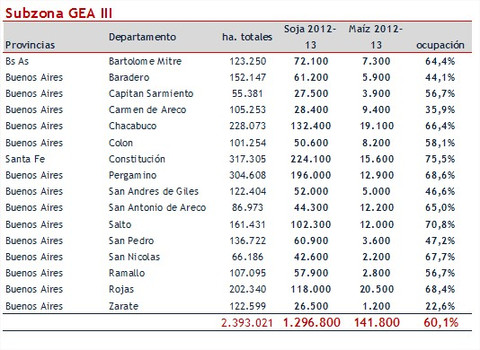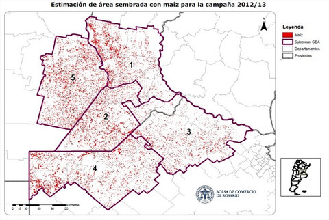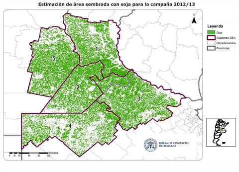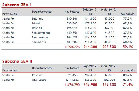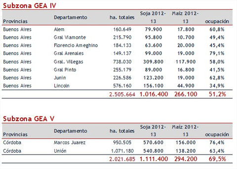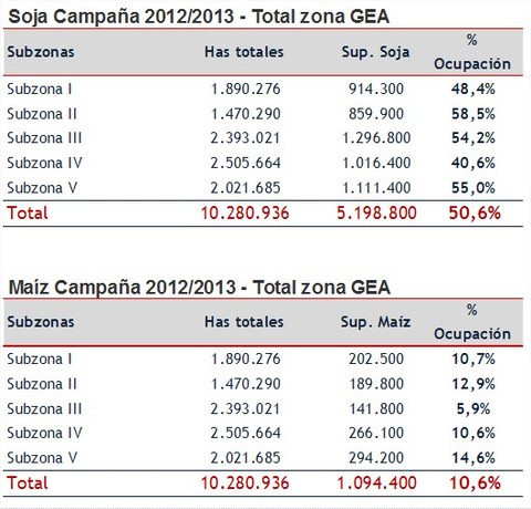 En la campaña 2012/2013 se cultivaron 5.198.800 hectáreas de soja y 1.094.400 hectáreas de maíz en la región núcleo que GEA – Guía Estratégica para el Agro sigue periódicamente. Para la obtención de esta cifra de superficie sembrada se realizó la clasificación de cultivos con tecnología satelital. En lo que se refiere a la campaña 2013/2014, de acuerdo con las encuestas realizadas sobre la región núcleo en precampaña, los productores manifiestan una tendencia a aumentar el área de soja cercana al 10%, a la vez que reducirían entre un 10 y un 20% la superficie maicera.