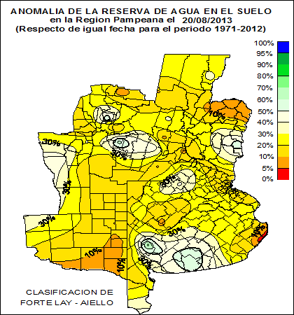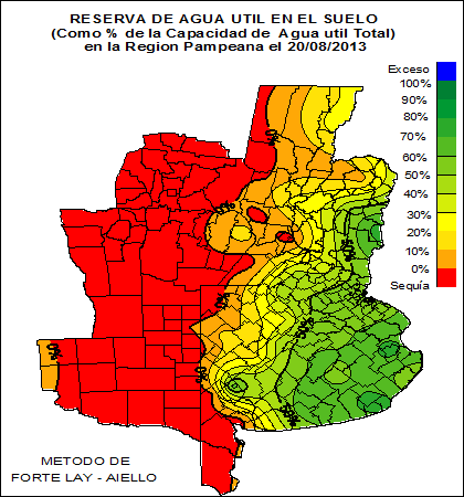 RESERVA DE AGUA ÚTIL EN EL SUELO (como % de la capacidad de agua útil total) en la Región Pampeana el 20 de Agosto de 2013