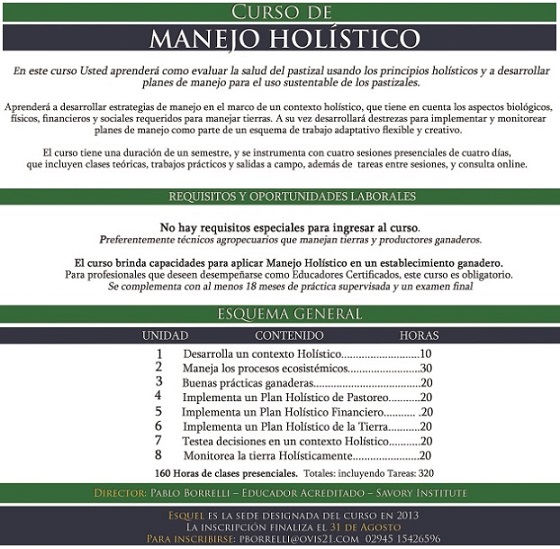 Es un curso de teórico-práctico que dura un cuatrimestre, orientado a profesionales agropecuarios y productores. Su intensidad y profundidad permiten el desarrollo de capacidades para dominar los procedimientos de planificación del pastoreo, financiera y de la tierra.
