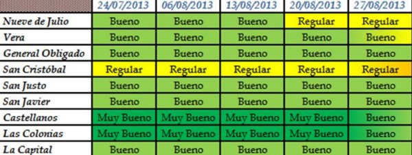En el noroeste, centro y oeste del departamento San Cristóbal, departamento 9 de Julio, sur del departamento Vera, norte y centro del departamento San Justo y centro-sur del departamento San Javier, la disponibilidad de agua es regular (valores inferiores a 15,3), lo que se traduce en el desarrollo de los cultivos y/o germinación con dificultades.