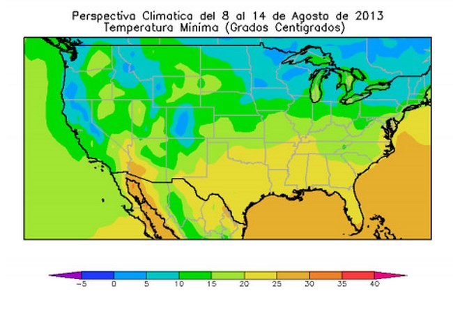 • El sur del área triguera, la mayor parte del Delta y la mayor parte de la Región Sudeste, registrará temperaturas mínimas superiores a 15ºC. Este proceso será acompañado por fenómenos extemporáneos como sequía severa para partes de las Grandes Planicies, el Valle de Río Grande, las Rocallosas, el Sudoeste, la Gran Cuenca y California.