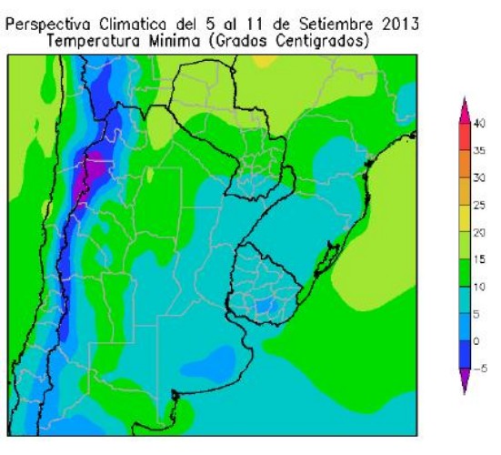 • El centro este del NOA, el este y el centro de Cuyo, el este de la Región del Chaco, la mayor parte de Mesopotamia, la mayor parte de la Región Pampeana, la mayor parte del Uruguay, el este de Paraná, la mayor parte de Santa Catarina y Río Grande do Sul, observarán temperaturas mínimas entre 5 y 10°C con escaso riesgo de heladas.