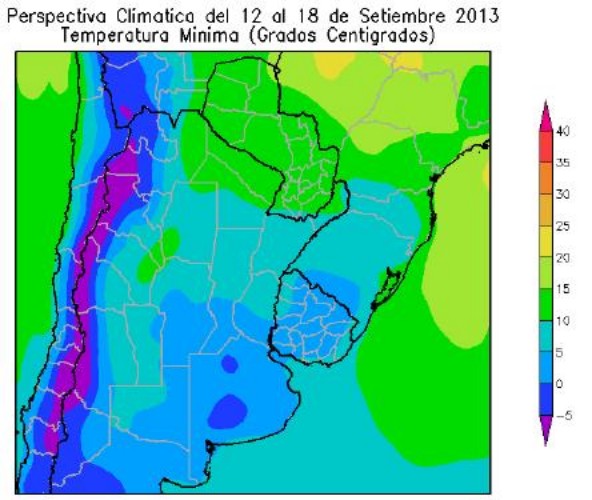 • El centro-oeste del NOA, el centro de Cuyo, la mayor parte de la Región Pampeana, la mayor parte del Uruguay y el sur de Río Grande do Sul, registrarán temperaturas mínimas entre 0 y 5ºC.