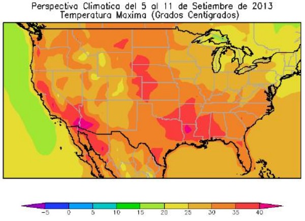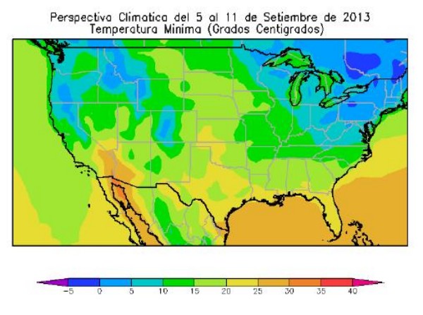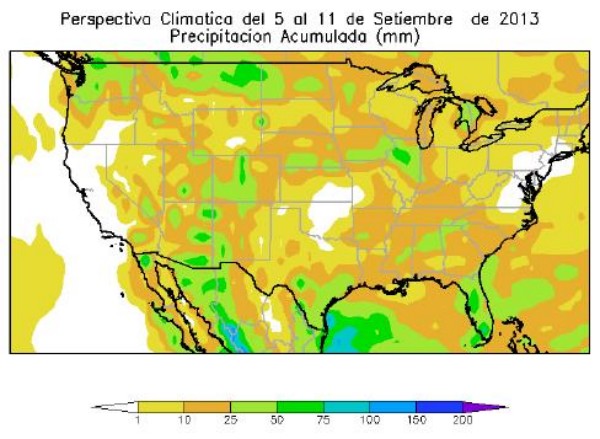 A principios de la perspectiva, se producirá la entrada de vientos del norte que causarán un marcado descenso térmico en el norte del área agrícola norteamericana, mientras que el sur continuará recibiendo vientos de trópico. Posteriormente, entrarán vientos del norte, produciendo un lapso con temperaturas sensiblemente superiores a lo normal. Las precipitaciones serán de carácter muy disperso, variando desde valores escasos hasta moderadamente abundantes. Este proceso será acompañado por fenómenos extemporáneos: 6-8 de Setiembre: Temperaturas muy por encima de lo normal para partes del norte y centro e las Planicies, el Vale medio y alto de Mississippi; 13-14 de Setiembre: Temperaturas muy por encima de lo normal para el norte de las Planicies, el Valle de Río Grande, las Rocallosas, el Sudoeste, la Gran Cuenca y California.