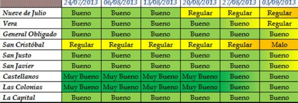 Humedad de los suelos: En el noroeste, centro y este del departamento San Cristóbal, gran parte del departamento 9 de Julio; sur de Vera; norte y centro de San Justo y centro y sur de San Javier, la disponibilidad de agua es de “regular a mala” (valores inferiores a 13,9), lo que se traduce en el desarrollo de los cultivos y/o germinación, con marchitez de los cultivos.
