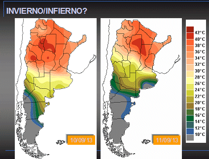 Durante el último fin de semana comenzó a observarse una fuerte circulación del sector norte. La masa de aire que se fue incorporando a la región pampeana tenía como origen las zonas secas del NOA y de Santiago del Estero. La misma no encontró resistencia en su avance hacia el sur. Por otro lado la presencia de un sistema de alta presión sobre el continente durante el lunes generó un calentamiento aún mayor de la masa de aire cálido. Esta configuración devino en el despliegue de temperaturas máximas que ya no pueden catalogarse de inusuales, sino que han marcado nuevos valores record en gran parte del centro norte del país. En la ciudad de CB, por ejemplo la máxima del martes superó los 40°C, lo cual claramente no ayudo a sofocar los graves incendios que afectan los valles serranos. Por otra parte hacia el sur y sobre la zona núcleo, los valores fueron más bajos pero igual quebraron el record de las estadísticas de máxima de septiembre. Es decir el final del invierno durante el martes fue propiamente un infierno. El miércoles el aire más caliente comenzó a ser desplazado hacia el este y el noreste y fue entonces el este del NOA, el NEA y gran parte de la Mesopotamia las zonas que se llevaron la peor parte. Este movimiento del aire cálido hacia el este noreste, se observa con claridad en los mapas de temperatura máxima del martes y miércoles.