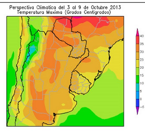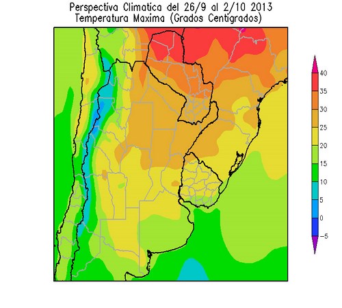 • El norte del sur del Brasil, la mayor parte del Paraguay y el nordeste de Salta, observarán temperaturas máximas superiores a 30ºC, observándose sobre la misma, focos de temperaturas superiores a 35ºC.