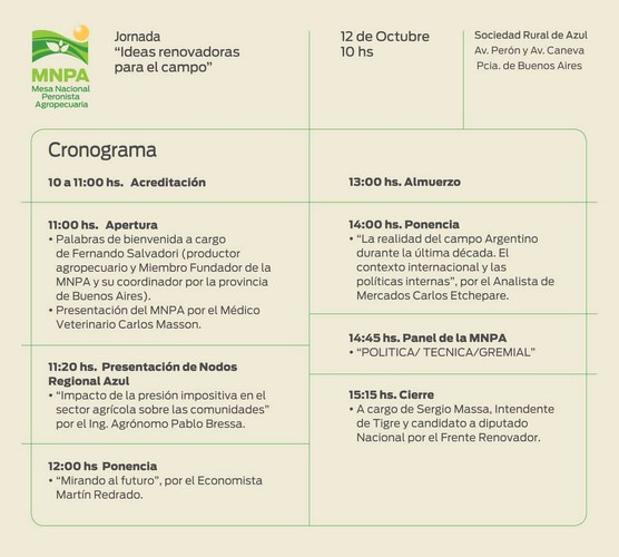 La Mesa Nacional Peronista Agropecuaria (MNPA) organizará una jornada el día sábado 12 de octubre en la ciudad de Azul, provincia de Buenos Aires, con