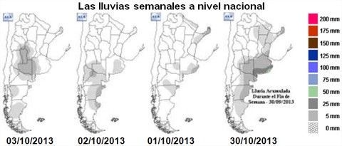 En la semana el acumulado más importante fue en Rufino, Santa Fe, con 16,4 mm. Por fuera del extremo sur de Santa Fe y norte de Buenos Aires, llovió muy poco, sólo entre 2 y 6 mm. Las reservas hídricas siguen deteriorándose, especialmente sobre Córdoba y Santa Fe, donde se observan condiciones de sequía en la totalidad del área. También fue otra semana de bajas temperaturas. Las máximas estuvieron por debajo de los parámetros normales, y las mínimas fueron muy bajas para la época del año con niveles de 1 a 4ºC. Los pronósticos de esta semana para el 3 y 4 de octubre marcaban posibilidades de recibir lluvias de entre 10 y 15 mm. Pero nuevamente, el agua no cumplió con las expectativas: sólo el noreste bonaerense fue privilegiado con lluvias de 10 a 35 mm el viernes 4 de octubre.