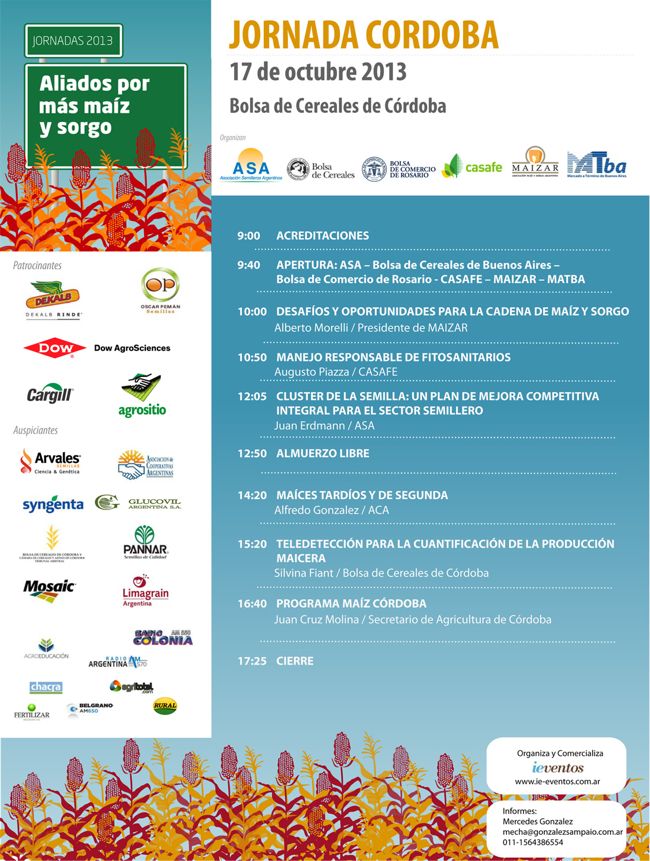 La Jornada contará con la participación de prestigiosos oradores como el Ing. Alberto Morelli (MAIZAR), el Ing. Augusto Piazza, asesor externo de CASAFE, el Ing. Juan Erdmann (ASA), el Sr. Alfredo González (ACA), la Sra. Silvina Fiant de la Bolsa de Cereales de Córdoba y, el Ing. Juan Cruz Molina, Secretario de Agricultura de la provincia de Córdoba.