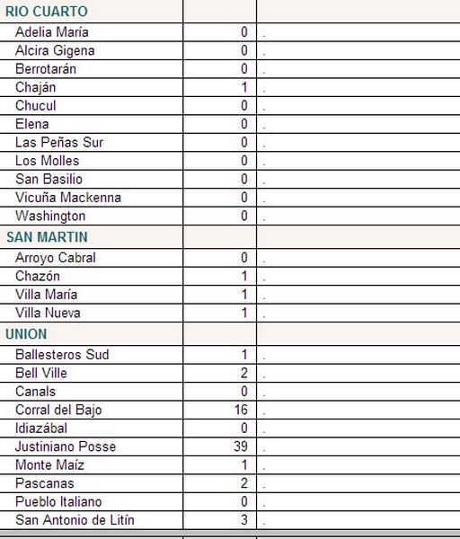 Rafaela- centro oeste: 12 Hughes- Depto. Gral. Rodríguez: 10 San Gregorio- Depto Gral. López: 10 Sancti Spiritu- Depto Gral. López: 10 Zenón Pereyra- Depto. Castellanos: 10 Bauer y Sigel- Depto. Castellanos: 20 Col Margarita- Depto. Castellanos: 15 Fraga- Depto. Castellanos: 15