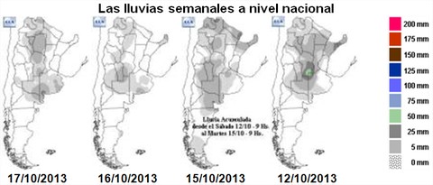 Otra semana de lluvias y algunas tormentas puntuales. Algunas fueron muy intensas, con caída de granizo y ráfagas de viento muy fuertes. Muchos sectores fueron marginados nuevamente del agua. Contrastan los 141,6 mm que llegaron como una tromba y se batieron en tres horas sobre Monte Buey (Córdoba), con los 0 mm de Bigand o Idiazabal o Montes de Oca o… El resto de la región GEA, en promedio, osciló entre 10 y 50 mm. El norte de Buenos Aires fue nuevamente favorecido pero esta vez las mayores cargas pluviales cayeron sobre la porción más occidental. Hubo algunas lluvias interesantes en el sector más profundo del sur de Santa Fe aunque aisladas. Se destacaron los altos registros térmicos al volver la circulación del sector norte. Las máximas se mantuvieron entre 33 y 35ºC. El déficit de humedad se empieza a revertir en algunos sectores a nivel superficial pero no en profundidad. Para los próximos días, y pese a que la región está dominada por la presencia de un centro de alta presión, se esperan precipitaciones puntuales con caída de granizo y ráfagas de viento. El paso de un importante frente frio generaría precipitaciones y un abrupto cambio de temperaturas a partir del lunes 18 de octubre. No se descarta que pueda producir una helada agronómica (temperatura inferior a los 3ºC).