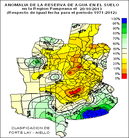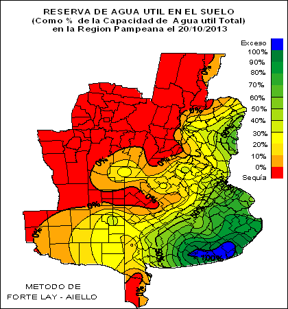 RESERVA DE AGUA ÚTIL EN EL SUELO (como % de la capacidad de agua útil total) en la Región Pampeana el 20 de Octubre de 2013