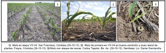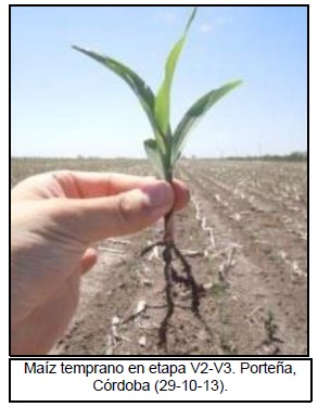 Hacia la provincia de córdoba, los retrasos en las labores de siembra son muy marcados, a pesar de que en estas zonas el productor tiene la posibilidad de retrasar la fecha de siembra y de no perder potencial de rendimiento. Los cuadros que fueron implantados en fechas tempranas hoy transitan estadíos vegetativos en condiciones regulares a causa de un largo período sin precipitaciones. A nivel sanitario se registran problemas con chinche de los cuernitos y algo de oruga cortadora.