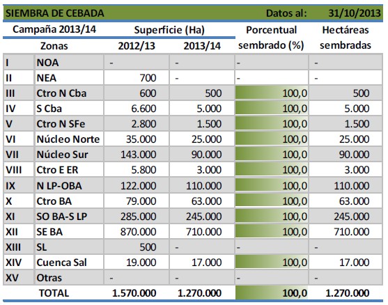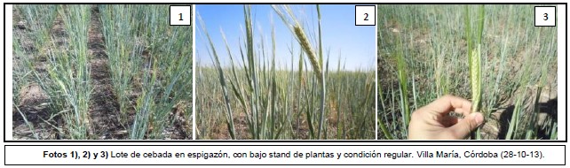 A pocos días del comienzo de la cosecha de cebada en la región Núcleo Norte, el cultivo evoluciona de regulares a malas condiciones, con importantes pérdidas de rendimiento y área sobre dicha región. Algo similar se aprecia en otras zonas como el norte y sur de Córdoba, centro-norte de Santa Fe y Entre Ríos, aunque cabe destacar que la superficie aportada por todas estas regiones en su conjunto no supera el 3 % de las 1.270.000 hectáreas implantadas a nivel nacional.