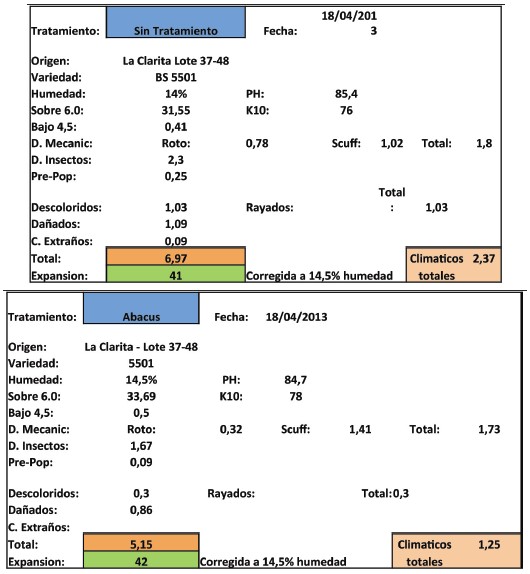 Se observa una respuesta significativa en los tratamientos con fungicida, dando un promedio de 370 kgs/ha de ganancia versus el testigo. También se observa el mejoramiento en la calidad de la semilla, lo que reduce las pérdidas por daño climático y mejora la expansión, lo cual es beneficioso a la hora de comercializar el producto.
