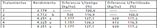 Cuadro 1: Rendimiento (kg/ha) y diferencias sobre el testigo absoluto y sobre el tratamiento fertilizado