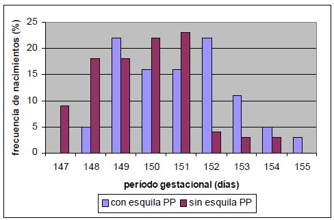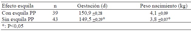 El grupo esquilado presentó un período de gestación promedio 1,4 días más largo que el del grupo no esquilado (P<0,05) (Cuadro 1).
