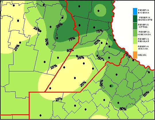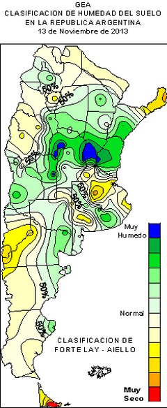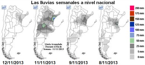 El período (7 al 14 de noviembre) empezó con lluvias y terminó con lluvias. Las primeras dejaron acumulados muy significativos en algunos sectores como en Villegas (Buenos Aires) donde superó los 90 mm. El otro epicentro de lluvias significativas fue la zona de Ramallo con 80 mm. Las lluvias recientes fueron más localizadas, dejando en el corredor que va de Rosario a Monte Buey precipitaciones 20 a 50 mm, coincidiendo los núcleos máximos de lluvias en las localidades citadas. Después de las voluminosas descargas de los primeros días de lluvias que dejaron en algunas zonas severos problemas de anegamiento y escorrentías, lluvias más moderadas alejaron los temores de que se repitieran estos inconvenientes. Estos últimos aportes permitieron revertir los déficits de humedad que todavía se observaban en algunas áreas, contribuyeron significativamente a la mejora de reservas en los perfiles de los suelos de la región y contribuyeron a las emergencias de la última tanda sembrada con soja.