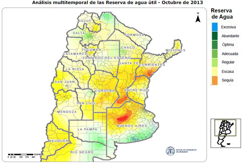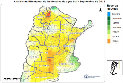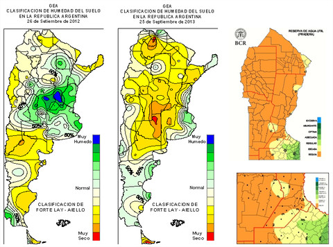 En lo que se refiere a lluvias, setiembre se comportó como julio. La distribución fue típica de un mes de invierno, con precipitaciones recostadas sobre el margen este del país, cuando setiembre es un mes en el que comienzan a desplegarse las lluvias importantes sobre el oeste, y que suelen constituir las reservas de humedad en los suelos. Se destaca el desenvolvimiento de las precipitaciones en el este y sur bonaerense que recibió precipitaciones incluso por encima de los valores históricos. En las imágenes siguientes se ve con claridad cómo estaban las reservas de humedad a fines de septiembre de este 2013, con relación a fines de septiembre de 2012. Por otra parte, se hace la misma comparación de comportamientos, pero enfocando la escala en la zona central.