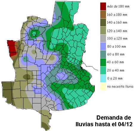 No obstante este favorable cambio, aún se mantienen zonas donde el perfil no se ha recuperado en su plenitud y justamente es allí donde la demanda se mantiene en niveles elevados. Para constatar los requerimientos hídricos podemos estimar cuanta lluvia sería necesaria para que una pastura alcance o mantenga niveles adecuados de reserva en el primer metro de suelo. El escenario resultante es una hipótesis de máxima demanda, la cual seguramente no es tan elevada para las siembras, sin embargo permite identificar sectores que potencialmente se encontrarían más vulnerables a deficiencias hídricas ante una oferta empobrecida o ante un pulso seco.