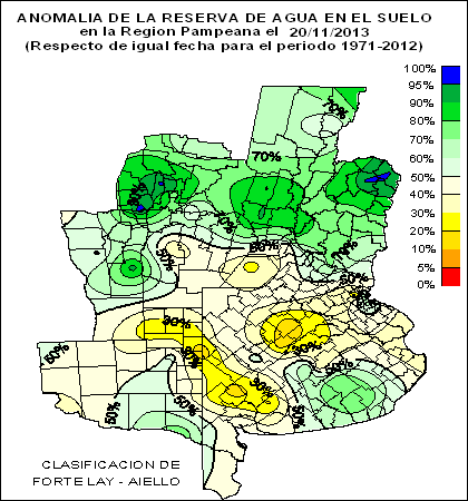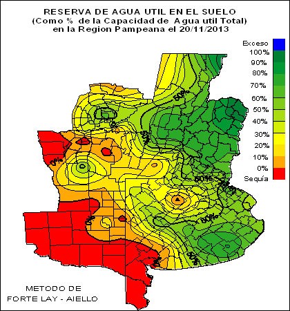 RESERVA DE AGUA ÚTIL EN EL SUELO (como % de la capacidad de agua útil total) en la Región Pampeana el 20 de Noviembre de 2013