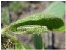 En las plantas menores de 10cm de altura esta plaga consume, con preferencia, brotes y tallos tiernos. En este caso la planta puede recuperarse emitiendo brotes axilares, hecho que origina plantas más bajas que lo normal. En el momento de formación de vainas, el insecto las destruye parcial o totalmente, o bien las perfora, para consumir el grano en formación.