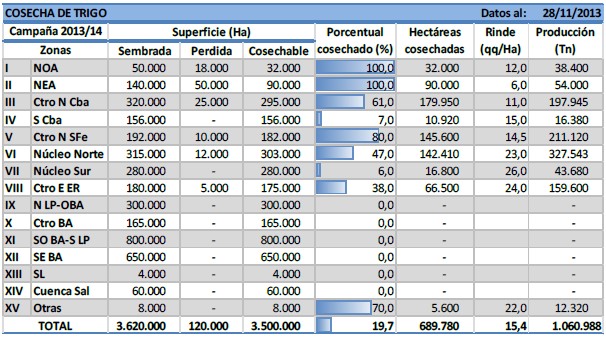 Durante los últimos días se cosecharon los primeros lotes en el norte bonaerense y sur santafecino (Núcleo Sur), con productividades que van desde los 15 a 35 qq/Ha. Esta región, si bien comenzó el ciclo con baja disponibilidad de humedad, logró recuperarse notoriamente, tal es así que se esperan picos de rendimientos de 50 qq/Ha. Otra de las regiones que dio comienzo a la trilla de trigo es el sur cordobés, en donde la situación es diferente ya que el cultivo acumuló escasas precipitaciones durante el ciclo y la perspectiva de rendimiento es baja. Los cuadros ya recolectados entregaron productividades que van desde los 6 hasta los 30 qq/Ha.