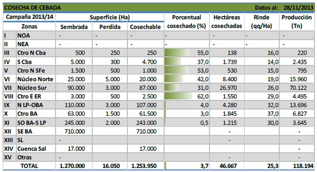 La trilla de cebada comienza a cobrar fluidez sobre el centro del área agrícola nacional. A la fecha se cosechó el 3,7 % del área apta, reflejando un retraso interanual de 3,3 puntos porcentuales. Dicha demora obedece al menor área sembrada en el centro del país (RN Nº5 al norte), en donde el ciclo previo las enfermedades afectaron fuertemente al cultivo de cebada. En números absolutos se recolectaron menos de 50 mil hectáreas, que entregaron un rinde promedio de 25,3 qq/Ha, permitiendo acumular un volumen en chacra superior a los 110 mil toneladas.