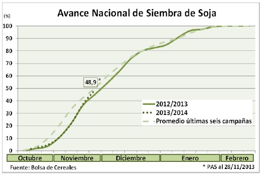 No sólo la siembra de primera cobró fluidez luego de la reposición hídrica, sino que también se generalizó la incorporación de lotes de segunda sobre el Núcleo Norte y simultáneamente se relevaron los primeros cuadros sembrados sobre rastrojo de trigo y cebada en sectores del Centro-Este de Entre Ríos y Centro-Norte de Santa Fe. Por último, nuestro informe climático anticipa lluvias en los próximos días sobre el norte de la región agrícola, mientras que el resto de la misma recibiría valores escasos. De cumplirse dichas perspectivas, la siembra podría avanzar sin interrupciones de cara a nuestro próximo informe, y simultáneamente la región NOA podría acumular favorables precipitaciones de forma previa al inicio de la siembra durante diciembre.