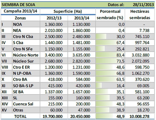 Luego de haber realizado recorridas a campo durante el mes de noviembre por las zonas Núcleo Norte y Sur, Centro-Norte y Sur de Córdoba y el Centro-Norte de Santa Fe, pudimos analizar la menor intención de siembra por parte del productor, debido al traslado a siembras tardías de cuadros que no pudo sembrar en fechas tempranas, reduciendo la superficie a implantar con este cultivo.