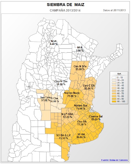 Se realizó un ajuste en el área a implantar para la campaña en curso. La imposibilidad de incorporar la totalidad de los cuadros programados para siembras tempranas, a causa de la sequía en gran parte de la región pampeana, y sumado a un traslado de superficie hacia el cultivo de soja, nos lleva a reducir el área estimada con maíz destino grano comercial.