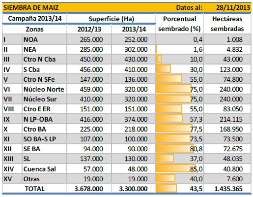 De esta forma, las zonas Núcleo Norte y Sur al igual que la provincia de Córdoba fueron recortando el área destinada al cultivo de maíz, transfiriéndolo en gran medida hacia el cultivo de soja. En consecuencia, la proyección nacional de superficie al presente informe pasa a ser de 3.300.000 Ha. Esta nueva estimación de área refleja una reducción de 160.000 Ha (-4 %) en comparación a nuestro informe previo, pero a su vez contempla una caída interanual de superficie de -10 % (Maíz 2012/13: 3,67MHa).