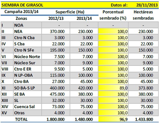 En zonas como el NEA y el Centro-Norte de Santa Fe, los cuadros de girasol ya se encuentran en estadíos avanzados; los que fueron sembrados a mediados de Julio están en pleno llenado de granos, y los que se implantaron entre Agosto y Septiembre en floración. Una característica a mencionar es que los lotes presentan una gran desuniformidad, y esto se debe a que tanto a la siembra como durante gran parte del desarrollo vegetativo del cultivo, se vieron afectados en gran medida por la falta de precipitaciones.