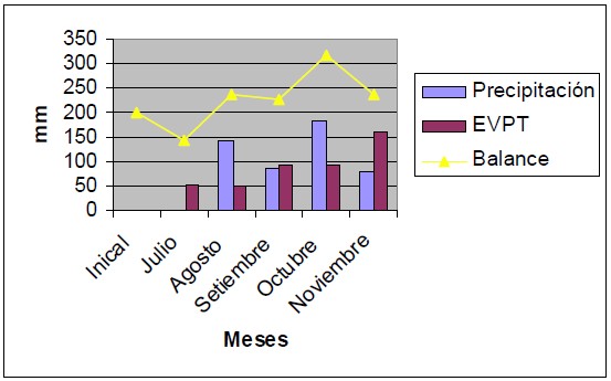Se debe considerar que los datos obtenidos en la presente campaña, deben ser tomados con cautela. Las malas condiciones que soportó el cultivo durante casi todo el ciclo hicieron que este no pueda expresar el rendimiento factible de obtenerse habitualmente en la zona. El suelo permaneció saturado durante casi todo el ciclo. El año 2012 fue en la historia de 9 de Julio, el año de mayores precipitaciones, si bien las mismas son variable a lo largo y ancho del partido, solo a título informativo, se informa que en la cabecera del partido recibió durante todo el año más de 1.900 mm. En el gráfico 1 se presenta un balance hídrico durante los meses de desarrollo del cultivo. Como se aprecia en el mismo, siempre el balance fue positivo, a tal punto de encharcar el suelo en ciertas ocasiones, gráfico 1.