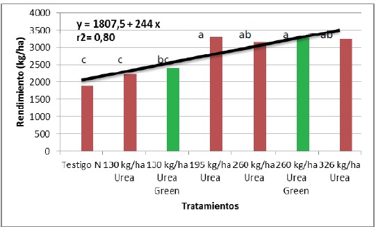Observando el comportamiento de los tratamientos, la urea tratada en ambos casos en la cual se aplicó, tuvo mejor comportamiento que la urea común, a igual dosis de aplicación, indicando de este modo un mejor aprovechamiento de la misma.
