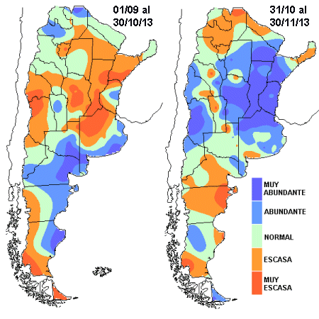 En el mapa de la izquierda se resume como se comportaron la precipitaciones hasta finales de octubre, justo en la transición hacia noviembre llegaron las lluvias que cambiaron todo. Esto queda expresado en el segundo mapa.