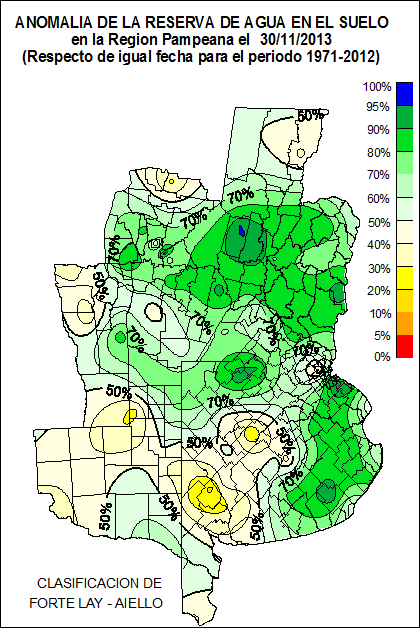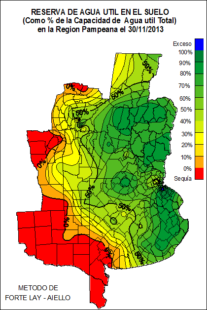 RESERVA DE AGUA ÚTIL EN EL SUELO (como % de la capacidad de agua útil total) en la Región Pampeana el 30 de Noviembre de 2013