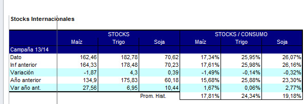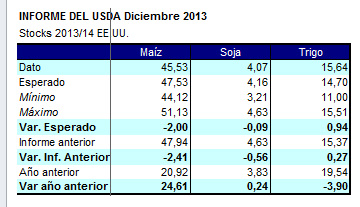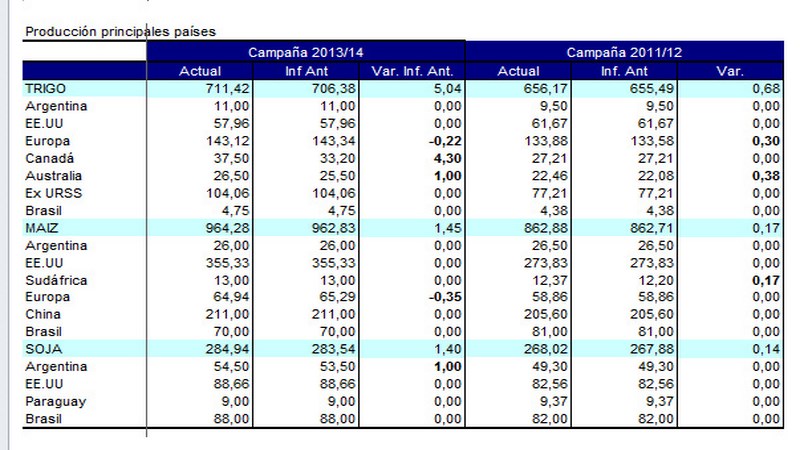 El elemento clave del reporte del USDA pasa por Sudamérica, ya que aumentó en un millón de toneladas la producción de Soja argentina 2013/14, pasándola de 53,50 a 54,50 millones de toneladas (M/Tns.). Mientras que respecto de las producciones de trigo y maíz argentinos de la campaña nueva, no realizó variantes, sosteniendo 11 M/Tns. de trigo y 26 M/Tns. de maíz