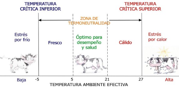 A partir de los primeros días y noches de altas temperaturas, si el ganado no puede “autorefrigerarse” y entran en situación de stress, mantienen la boca abierta, jadean, babean, les cuesta respirar, dejan de comer voluntariamente, y esto, asociado al aumento del consumo de energía metabólica para mantenimiento y regular la temperatura del cuerpo, produce baja de peso vivo, y disminución de la producción láctea. Al mismo tiempo se ven afectados los contenidos de grasas, proteínas, lactosa, calcio y potasio de la leche.