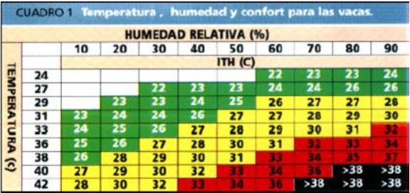 Esta combinación puede expresarse a partir del ITH (Hahn, 1999), un Indice compuesto por la Relación entre Temperatura ambiental y Humedad Relativa, que nos muestra cuando se produce stress a partir de los parámetros mencionados (Cuadro 1). Este indicador puede expresarse en diferentes valores, mas lo importante es recordar que las conjunciones de temperatura y humedad para el animal pueden significar un estado de confort, de stress leve, medio y grave, pudiendo llegar a la muerte.