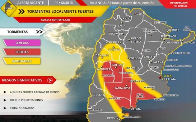 Una situación similar, con tormentas se presentó en La Pampa, Mendoza, San Luis, Río Negro, oeste y sudoeste de Buenos Aires, sudoeste y sur de Córdoba, La Rioja, San Juan, noreste de Chubut.