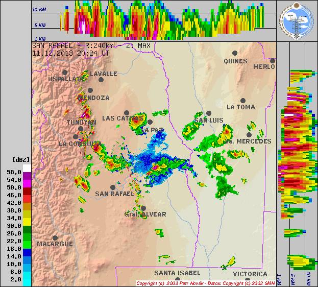 A lo largo de la noche se desarrollaron áreas de tormenta en la zona central, algunas localmente fuertes con ocasional caída de granizo, fuertes lluvias y ráfagas de viento con mejoramientos temporarios, situación que se repetirá en los próximos días.