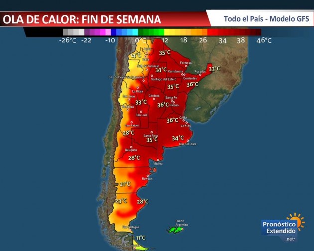 Según los modelos numéricos, las regiones más afectadas serían la zona central y norte nacional con valores entre 30°C y 40°C, sin descartarse valores superiores. La sensación térmica será elevada, lo que tornará el ambiente más insoportable (debido a la humedad). La Patagonia también estaría afectada, pero con valores menores.