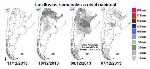 Las tormentas fueron nuevamente muy intensas y han estado acompañadas de intensos vientos y caída de granizo de forma aislada. Pero también estos milímetros siguen descontando al déficit anual y tienden a normalizar la media de la zona núcleo que alcanzó, en promedio, los 700 mm anuales. Las lluvias fueron muy variables; dejaron de 20 a 100 mm. Los dos epicentros de lluvias estuvieron en Bellville y Rufino con 100 y 90 mm respectivamente. Las zonas que menos acumulados recibieron fueron el noreste bonaerense y una pequeña franja que va desde Canals, Córdoba hasta Bigand, Santa Fe.