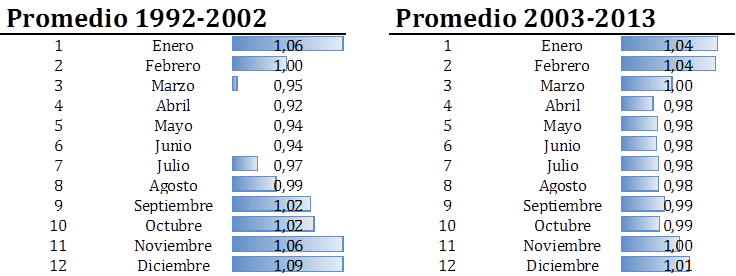 En cambio, la línea azul que representa los indicadores del período 2003-2013 se muestra más estable y “planchada” que la roja, no existiendo una fuerte oscilación en los precios como queda evidenciada en el período 1992-2002. La caída de los precios en época de cosecha en el período 2003-2013 es más moderada que la del período 1992-2002.
