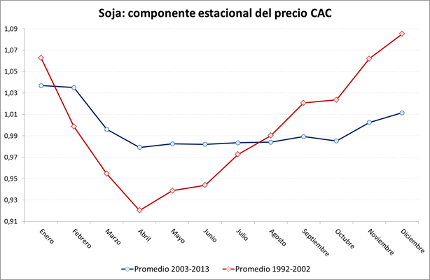 Como puede verse en el gráfico, la línea roja correspondiente al período 1992-2002 muestra que los precios cámara (CAC-BCR) de la soja en época de cosecha (Marzo-Abril-Mayo-Junio) registran una fuerte caída respecto de los registrados en la temporada estival, evidenciando una fuerte y marcada estacionalidad.
