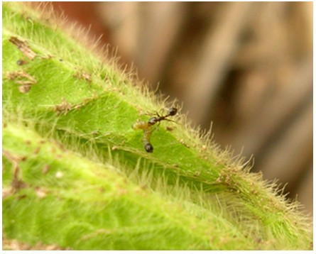 Las larvas recién nacidas se dirigen inmediatamente a los folíolos nuevos. Cuando la planta está bien hidratada, los folíolos se abren rápidamente descubriendo la hoja tri-foliolada. Pero cuando la planta está en estrés, cada folíolo permanece plegado mucho tiempo y la larva allí dentro está menos expuesta a condiciones climáticas adversas y a predatores. Solo una pequeña hormiga colorada puede encontrarla con éxito y alimentarse de ella.